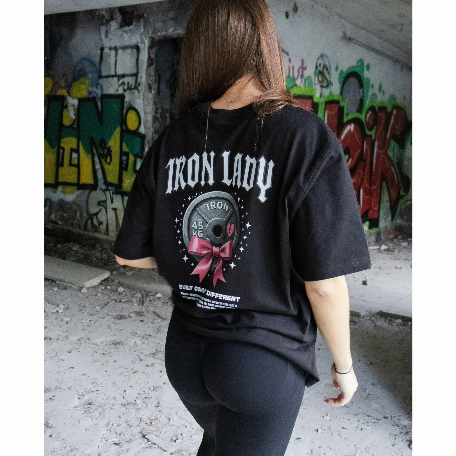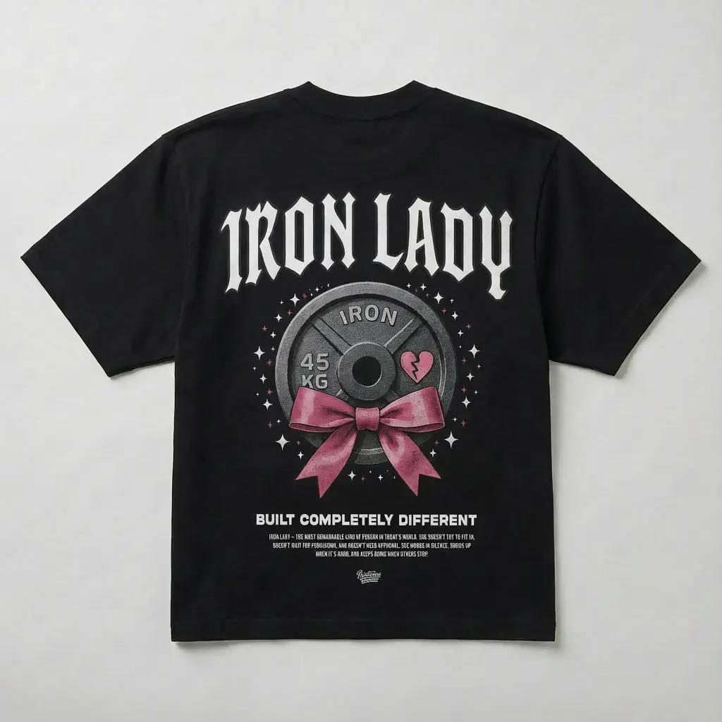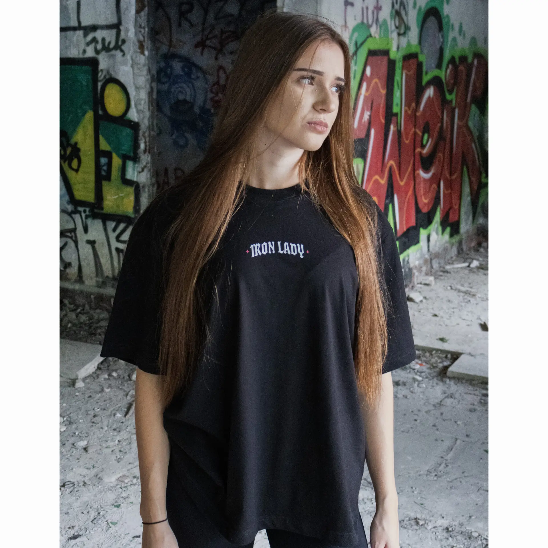 Koszulka oversize Iron Lady to połączenie wygody i charakterystycznego stylu streetwear. Wykonana z wysokiej jakości bawełny zapewnia komfort noszenia i świetnie układa się na sylwetce. Nadruk DTF w odcieniach szarości i różu wyróżnia się trwałością oraz intensywnością kolorów, nawet po wielu praniach. Luźny krój gwarantuje swobodę ruchu podczas treningu, a wyrazisty design sprawia, że koszulka świetnie sprawdza się także w codziennych stylizacjach.